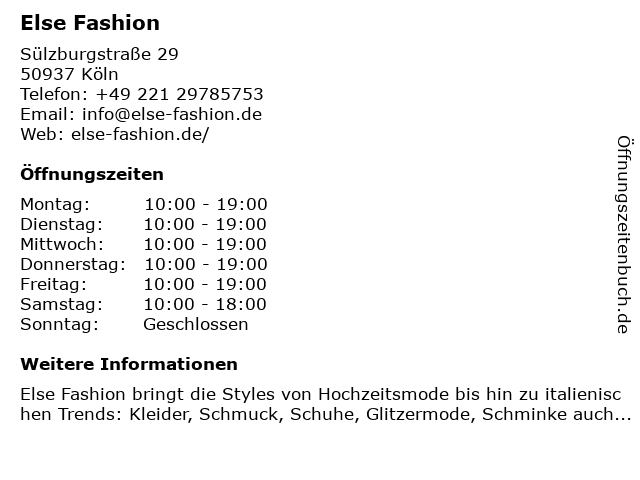 | Öffnungszeiten Else Fashion in Köln anzeigen | |
