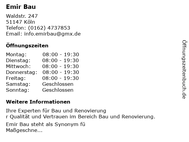| Öffnungszeiten Emir Bau in Köln anzeigen | |