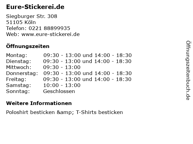 | Öffnungszeiten Eure-Stickerei.de in Köln anzeigen | |