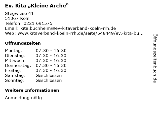 | Öffnungszeiten Ev. Kita „Kleine Arche“ in Köln anzeigen | |