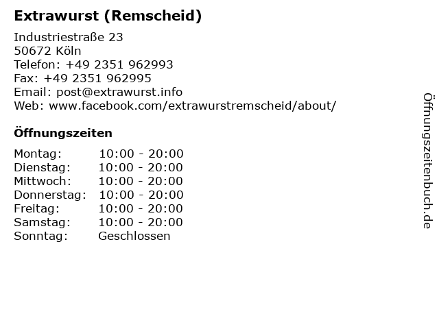| Öffnungszeiten Extrawurst (Remscheid) in Köln anzeigen | |
