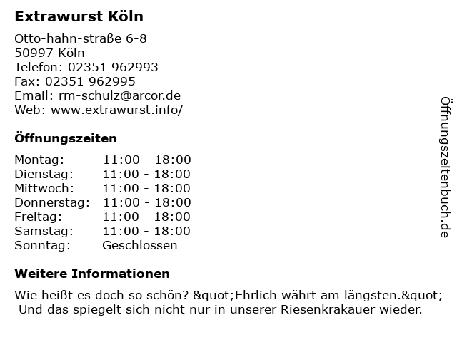 | Öffnungszeiten Extrawurst Köln in Köln anzeigen | |