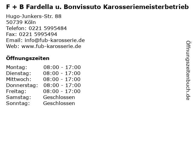 1 KFZ-Karosseriemeisterbetrieb Inh. Jörg Knoppke Autoservice (Entfernung: 14,16 km) Kirschbaumweg 28, 50996 Köln 2 Carlack Karosseriemeisterbetrieb - Bürozeiten (Entfernung: 19,79 km) Feldmühlestr 22, 53859 Niederkassel 4 Wissbaum GmbH Unfallinstandsetzungen Einbrennlackiererei (Entfernung: 2,69 km) Neusser Str. 708, 50737 Köln 6 |