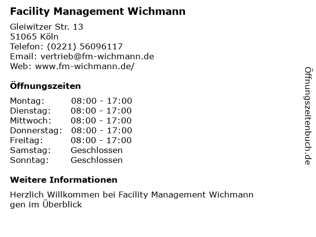 | Öffnungszeiten Facility Management Wichmann in Köln anzeigen | |