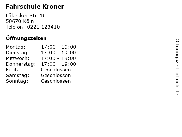 | Öffnungszeiten Fahrschule Kroner in Köln anzeigen | |