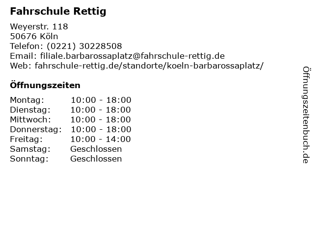 | Öffnungszeiten Fahrschule Rettig in Köln anzeigen | |