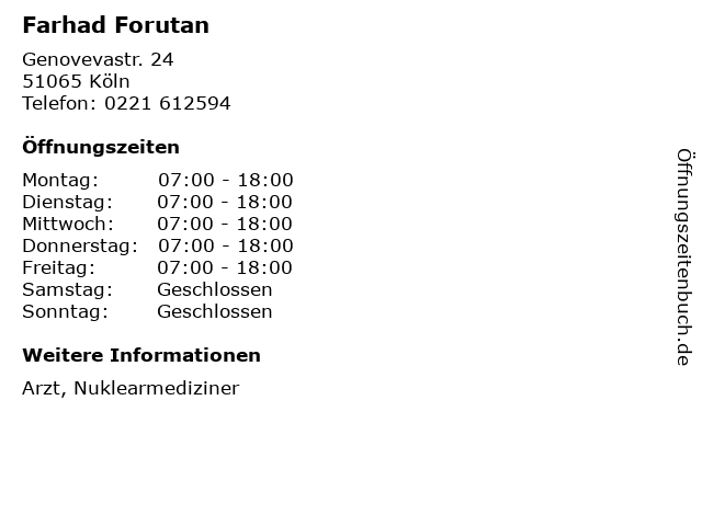 | Öffnungszeiten Farhad Forutan in Köln anzeigen | |