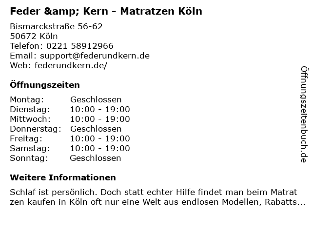 | Öffnungszeiten Feder & Kern - Matratzen Köln in Köln anzeigen | |