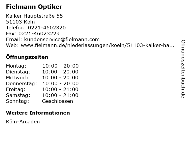 | Öffnungszeiten Fielmann Optiker in Köln anzeigen | |