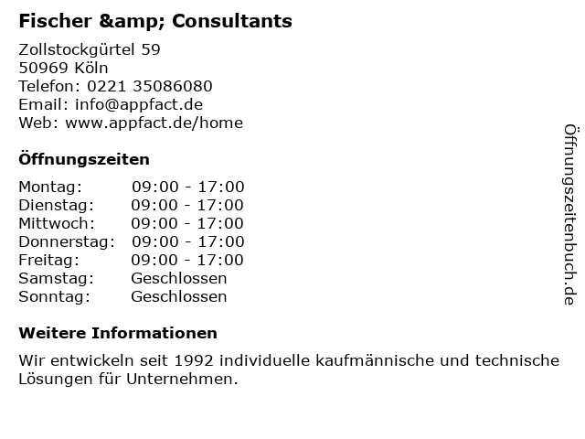 | Öffnungszeiten Fischer & Consultants in Köln anzeigen | |