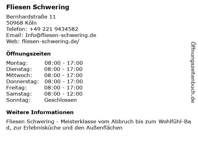 | Öffnungszeiten Fliesen Schwering in Köln anzeigen | |