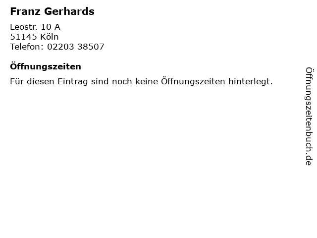 | Öffnungszeiten Franz Gerhards in Köln anzeigen | |