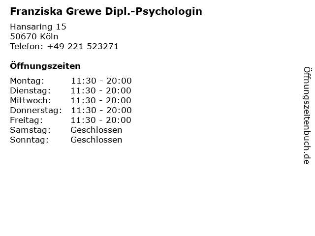 5 Dipl.-Psychologin Andrea Schaal Paartherapie, Sexualtherapie (Entfernung: 0,92 km) Apostelnstr. 28, 50667 Köln 6 Christiane Schmidt Diplom-Psychologin Psychologische Psychotherapeutin (Entfernung: 0,98 km) Gertrudenstraße 7, 50667 Köln |