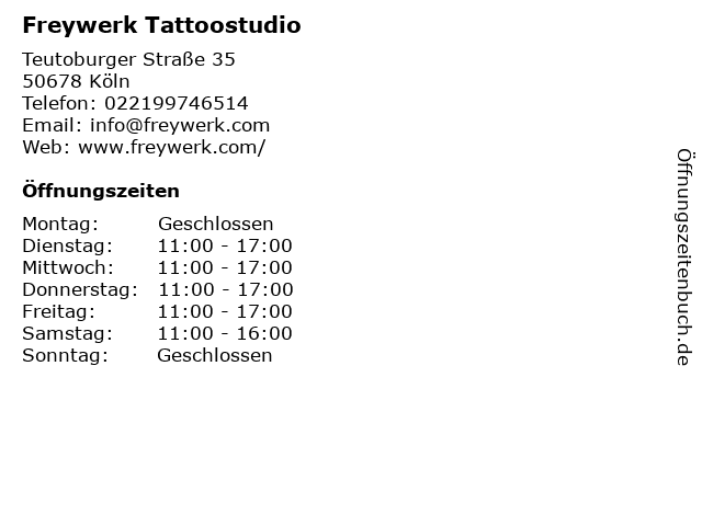 | Öffnungszeiten Freywerk Tattoostudio in Köln anzeigen | |