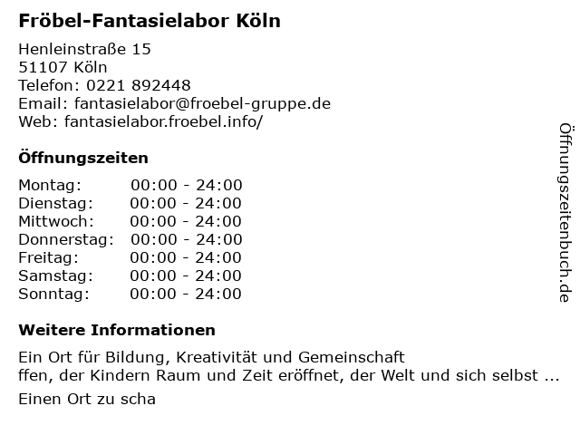 | Öffnungszeiten Fröbel-Fantasielabor Köln in Köln anzeigen | |