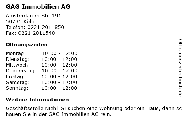 | Öffnungszeiten GAG Immobilien AG in Köln anzeigen | |