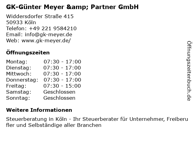 | Öffnungszeiten GK-Günter Meyer & Partner GmbH in Köln anzeigen | |