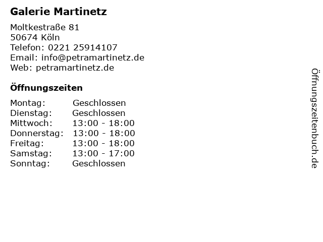 | Öffnungszeiten Galerie Martinetz in Köln anzeigen | |