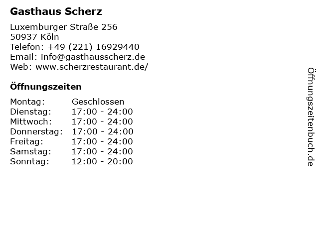 | Öffnungszeiten Gasthaus Scherz in Köln anzeigen | |