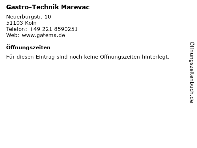 | Öffnungszeiten Gastro-Technik Marevac in Köln anzeigen | |