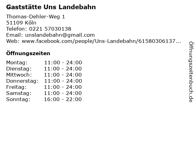 | Öffnungszeiten Gaststätte Uns Landebahn in Köln anzeigen | |
