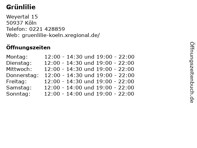 | Öffnungszeiten Grünlilie in Köln anzeigen | |