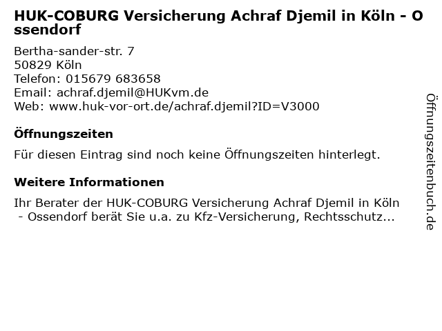 Hinweis: Ihr Berater der HUK-COBURG Versicherung Achraf Djemil in Köln - Ossendorf berät Sie u.a. zu Kfz-Versicherung, Rechtsschutzversicherung, Haftpflichtversicherung, Hausratversicherung, Wohngebäudeversicherung u.v.m.
