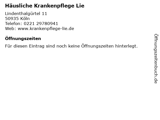 | Öffnungszeiten Häusliche Krankenpflege Lie in Köln anzeigen | |