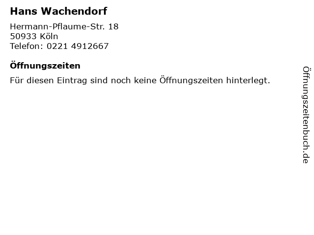 | Öffnungszeiten Hans Wachendorf in Köln anzeigen | |