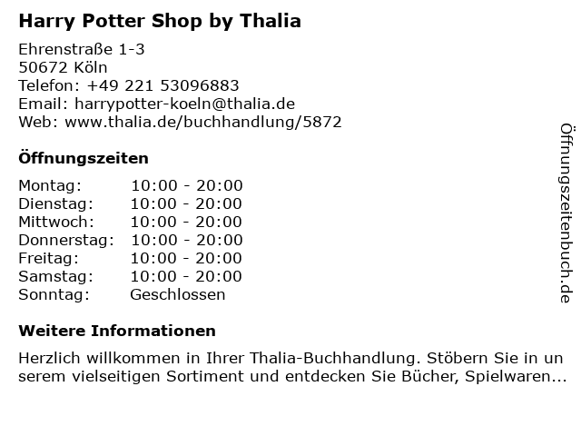 | Öffnungszeiten Harry Potter Shop by Thalia in Köln anzeigen | |