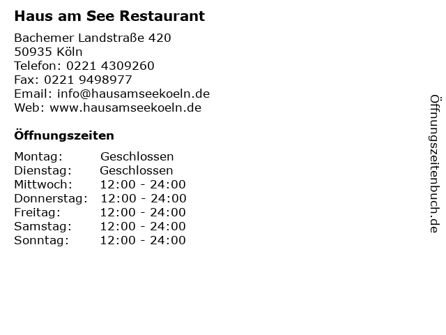 | Öffnungszeiten Haus am See Restaurant in Köln anzeigen | |