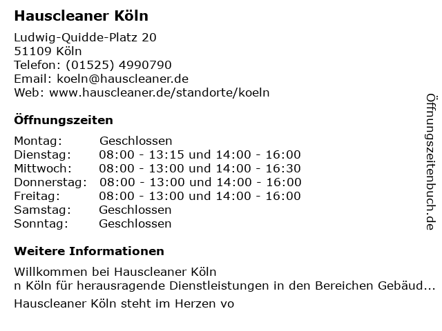 | Öffnungszeiten Hauscleaner Köln in Köln anzeigen | |