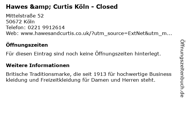 | Öffnungszeiten Hawes & Curtis Köln - Closed in Köln anzeigen | |
