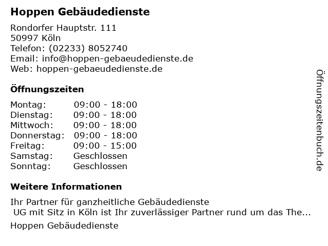 | Öffnungszeiten Hoppen Gebäudedienste in Köln anzeigen | |