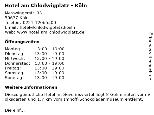 | Öffnungszeiten Hotel am Chlodwigplatz - Köln in Köln anzeigen | |