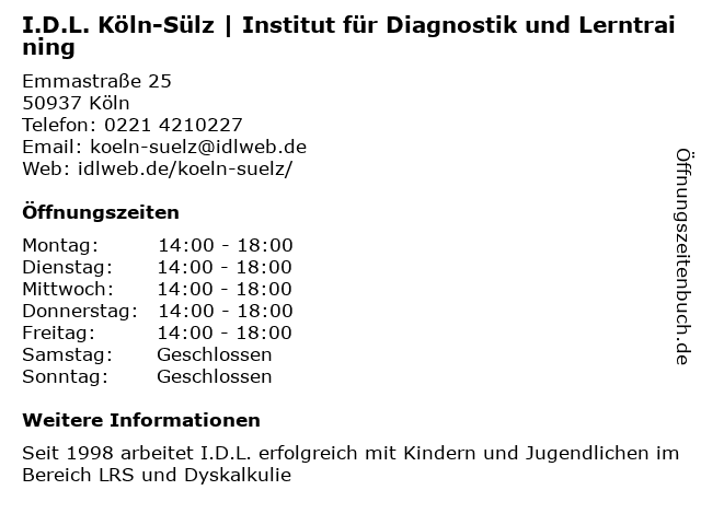 Branchen & Suchbegriffe zu I.D.L. Köln-Sülz | Institut für Diagnostik und Lerntraining:diagnostik, i.d.l., institut, lerntraining, sülz |