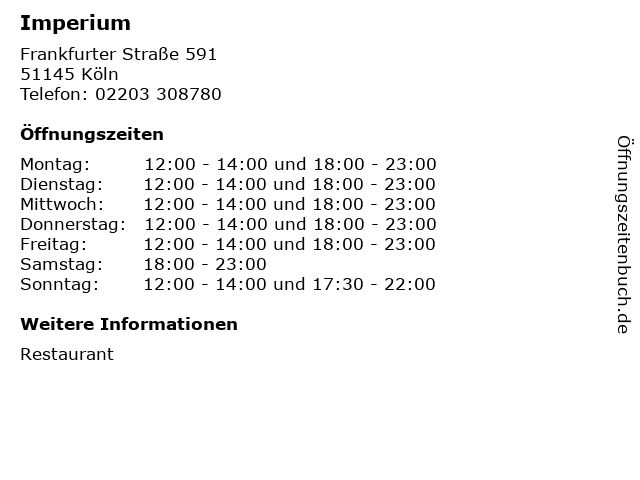 | Öffnungszeiten Imperium in Köln anzeigen | |