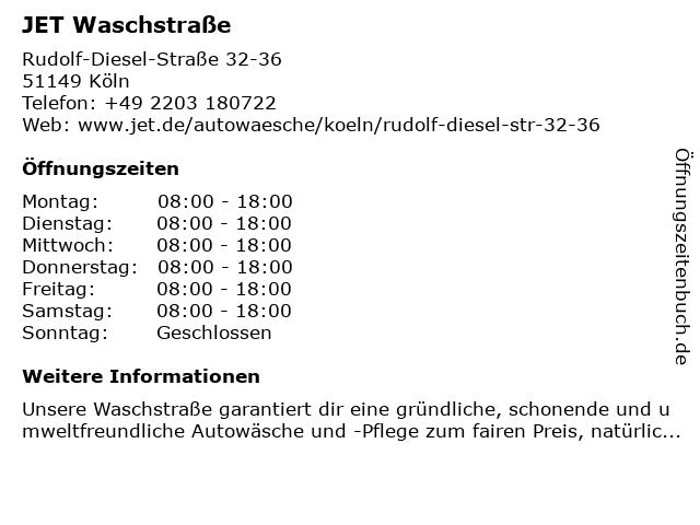 | Öffnungszeiten JET Waschstraße in Köln anzeigen | |