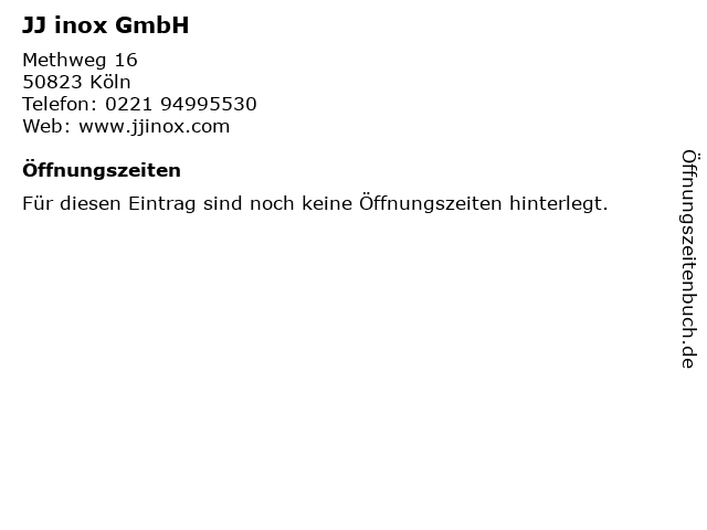 | Öffnungszeiten JJ inox GmbH in Köln anzeigen | |