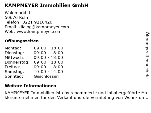 | Öffnungszeiten KAMPMEYER Immobilien GmbH in Köln anzeigen | |