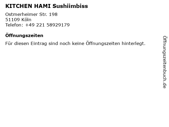 | Öffnungszeiten KITCHEN HAMI Sushiimbiss in Köln anzeigen | |
