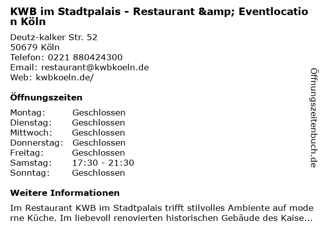 Öffnungszeiten KWB im Stadtpalais - Restaurant & Eventlocation Köln