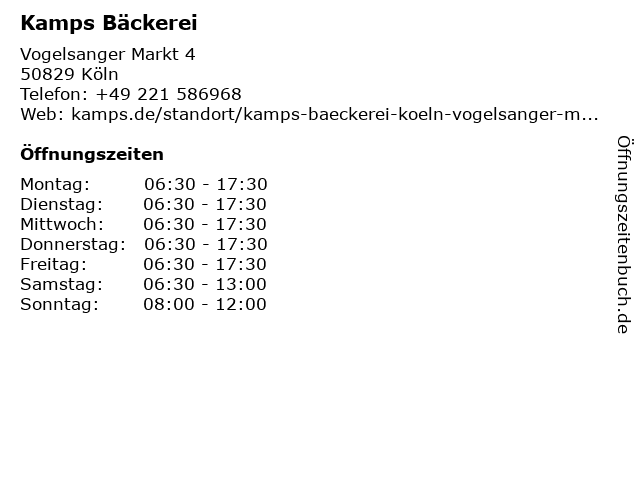 | Öffnungszeiten Kamps Bäckerei in Köln anzeigen | |