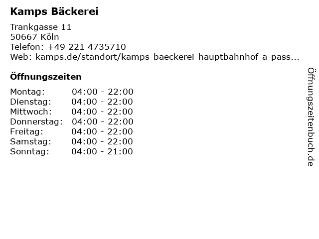 | Öffnungszeiten Kamps Bäckerei in Köln anzeigen | |