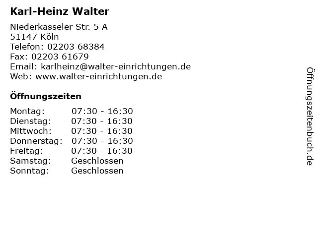 | Öffnungszeiten Karl-Heinz Walter in Köln anzeigen | |