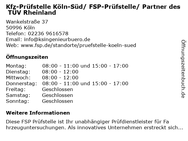 Öffnungszeiten Kfz-Prüfstelle Köln-Süd/ FSP-Prüfstelle/ Partner des TÜV Rheinland