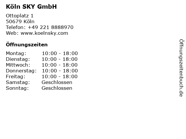 | Öffnungszeiten Köln SKY GmbH in Köln anzeigen | |