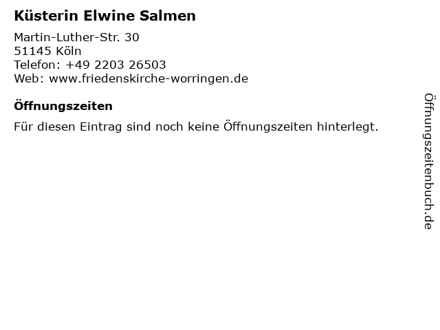 | Öffnungszeiten Küsterin Elwine Salmen in Köln anzeigen | |