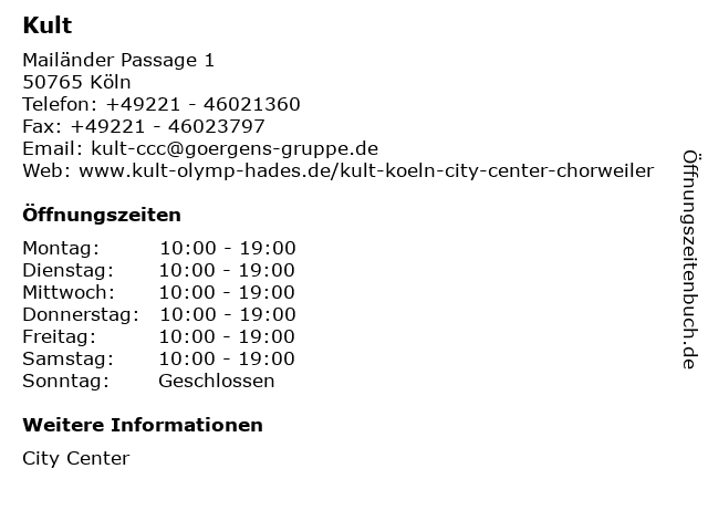 | Öffnungszeiten Kult in Köln anzeigen | |