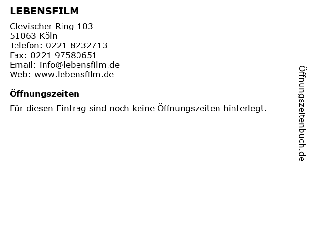 | Öffnungszeiten LEBENSFILM in Köln anzeigen | |